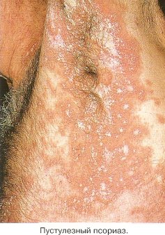 Псориаз пустулезный является проявлением крайней степени выраженности экссудативной формы и сопровождается появлением поверхностных мелкопустулезных элементов. Выделяют псориаз пустулезный Цумбуша, который имеет тяжелое течение и поражает любые участки «кожи. Первичным элементом при этом является пузырек, который быстро трансформируется в пустулу, вскрывается и засыхает в корку. Впоследствии на этих местах могут появиться типичные псориатические высыпания. Пустулы могут появляться и на типичных псориатических бляшках, как правило, в результате воздействия раздражающих медикаментов. Псориаз пустулезный Барбера ограничивается ладонями и подошвами, где на гиперемированных инфильтрированных участках кожи появляются «внутриэпидермальные мелкие пустулы. Процесс отличается симметричностью и частым поражением ногтевых пластинок.