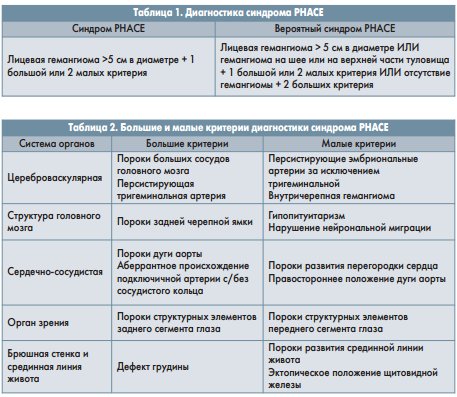 С момента описания синдрома PHACE, этот диагноз стали ставить большому количеству детей с значительными гемангиомами на лице, что привело в ошибочному пониманию этого заболевания. Учитывая этот факт, в 2008 году группа специалистов одобрила перечень диагностических критериев синдрома PHACE (таб.1, таб.2).