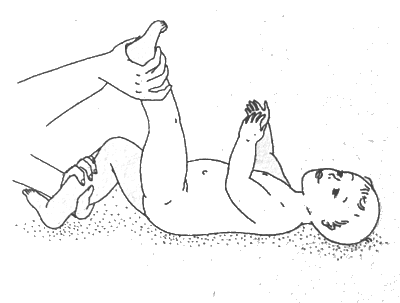 И. п. — ребенок лежит на спине. Взять ноги ребенка за голени так, чтобы большими пальцами обхватить икроножную мышцу. Поочередно поднимать прямые ноги, пока они не составят с поверхностью стола прямой угол, и затем опускать их. Проделать 4-5 раз каждой ногой.