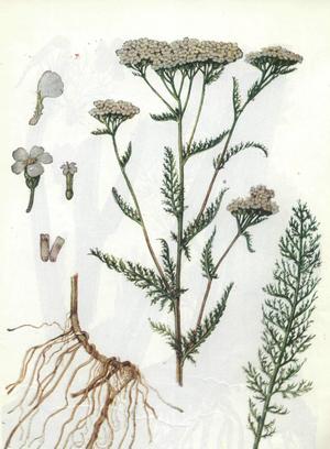Описание.Тысячелистник обыкновенный - травянистое, многолетнее растение с прямостоячим, до 50 см высоты, неразветвленным стеблем. Листья очередные, ланцетные или линейные, дважды-трижды перисторассеченные, листочки линейные, заостренные. На верхушке стебля собраны цветные корзиночки в форме густого щитка. Обертка корзиночек состоит из прилегающих черепичато расположенных листочков, которые по краям чешуйчатые, красновато-коричневого цвета, а в середине зеленого цвета. Каждая корзиночка состоит из 5 краевых, белых, язычковых и из 3—30 трубчатых, желто-бурого цвета цветочков. Цветет летом.