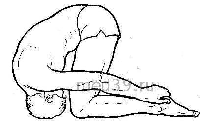 Затем теменем упритесь в пол, сделайте «подбородочный замок», не меняя положения ног, продвиньте спину и ягодицы вперед, пока руки, держащие пятки, не выпрямятся в локтях, Оставайтесь в этой позе (рис) на паузе после выдоха. Со вздохом вернитесь в исходное положение.